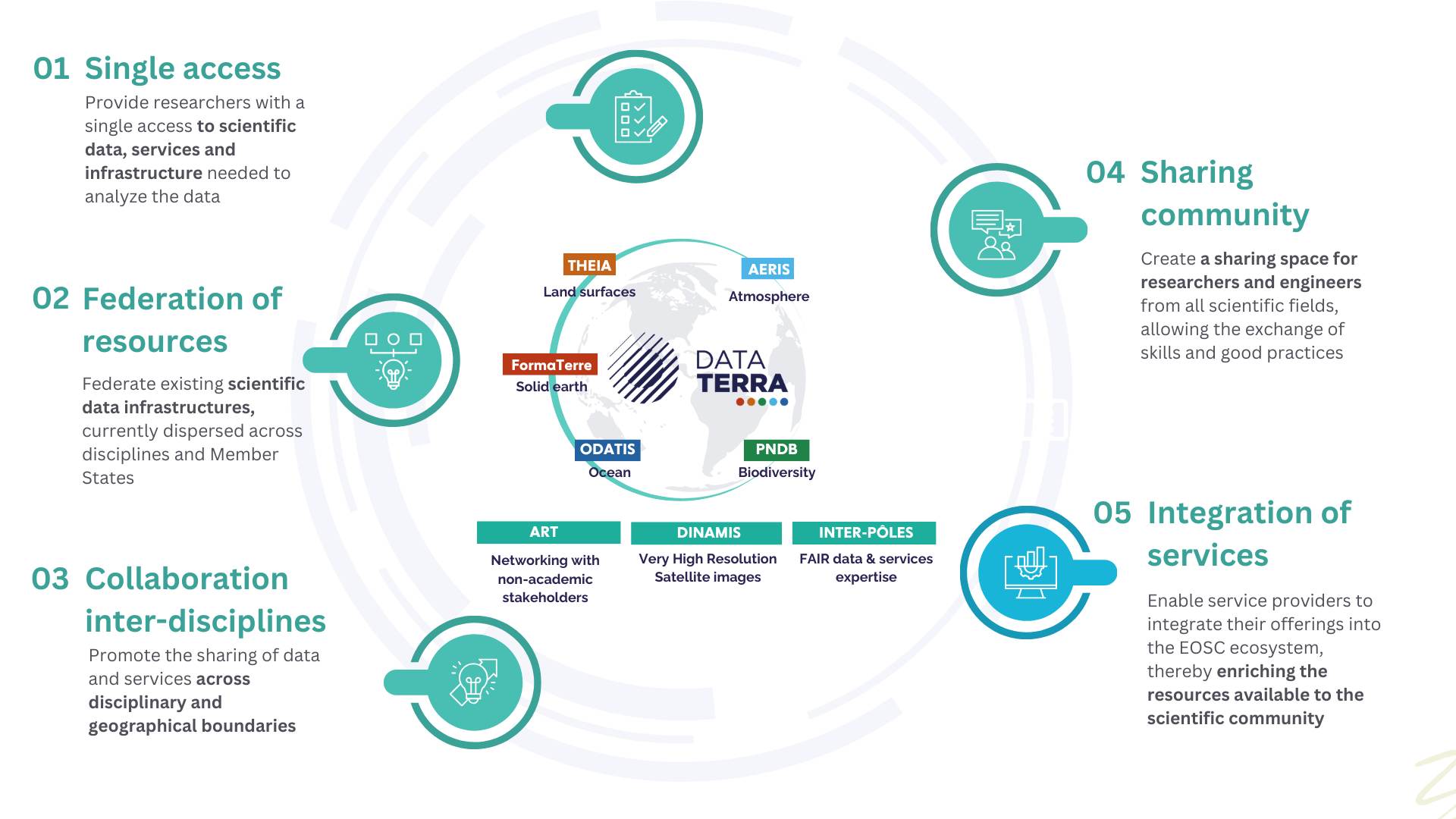 Data Terra consists of five main data and service hubs (or poles), each dedicated to a specific compartment of the Earth system: